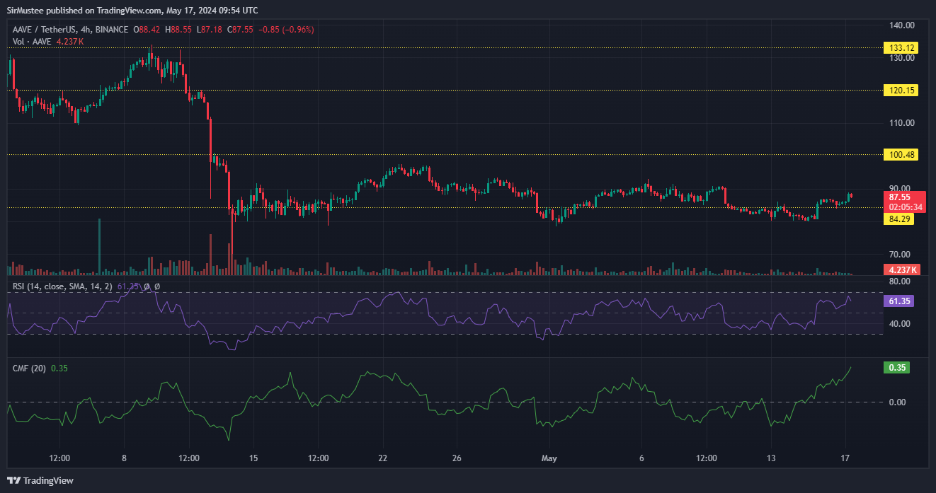 AAVE buyers found a price floor at the $80 level with a 5% rebound taking the altcoin above the $84 resistance level. Earlier in May, AAVE buyers had broken above the resistance level but quickly lost momentum, due to the selling pressure.