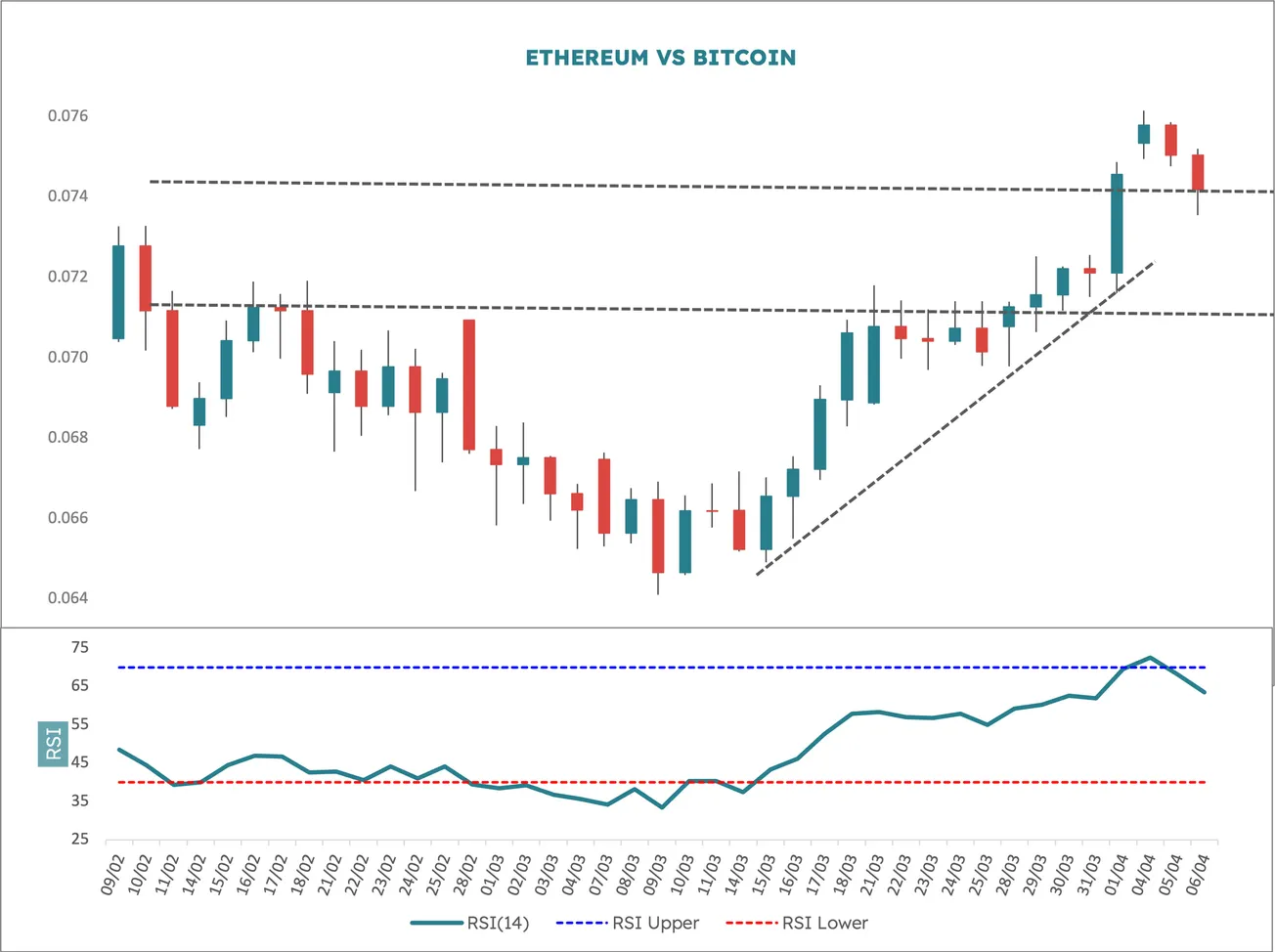 Two days ago the Ethereum-Bitcoin spread posted a real daily upgap, which is where there is no price print between the high of the previous trading session (in this case 1 April) and the low of the next closed session (4 April here). In other words, there is a price gap.