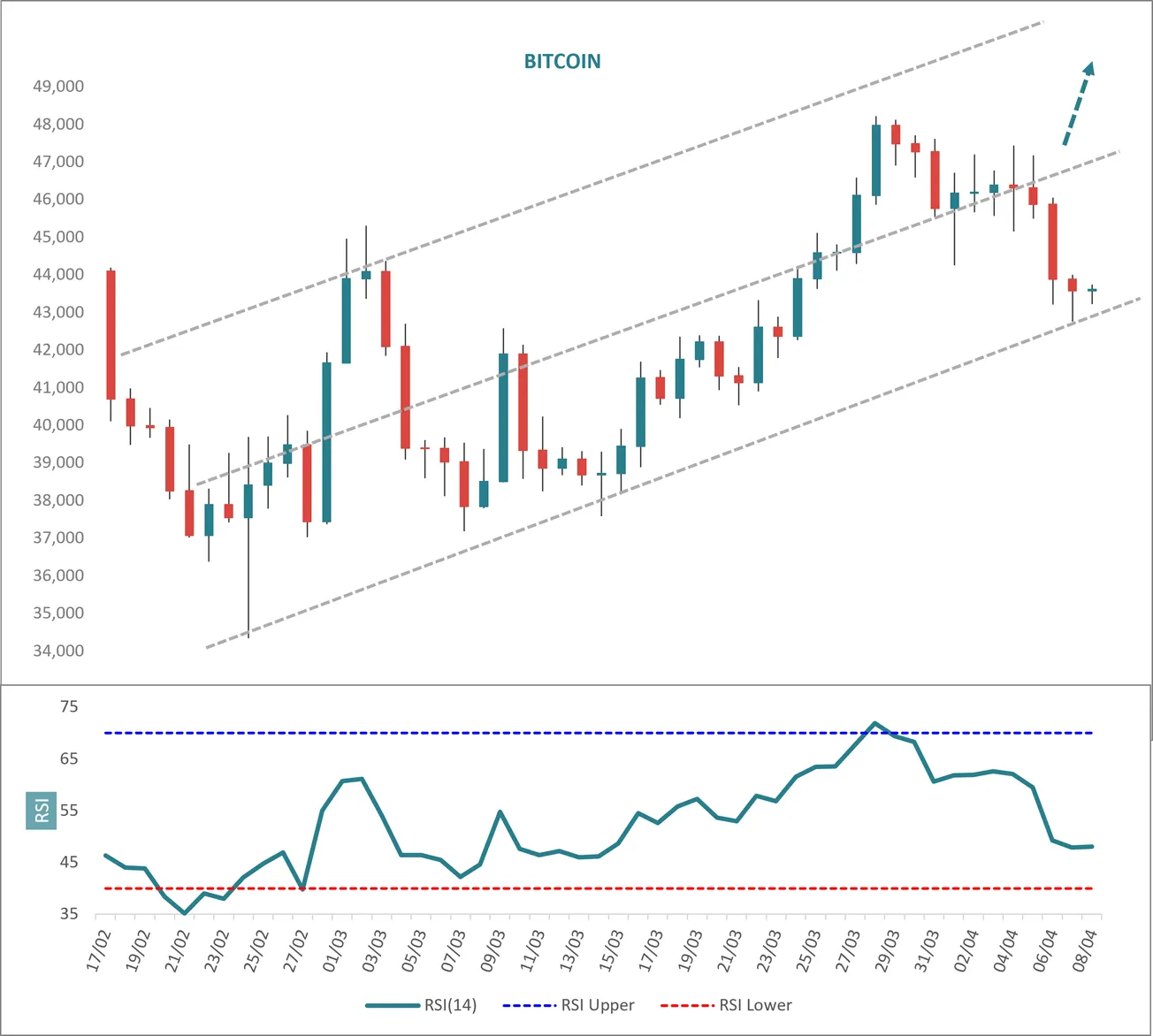 Notice also the arrow joining March and April RSI peaks. It points up, which tells us that uptrend power is intact across the structure, namely that there is some larger advancing force working behind the scenes.