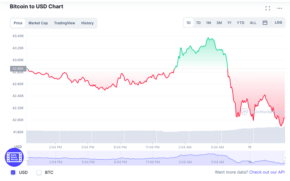 At the time of writing, Bitcoin (BTC) is trading at US$42,013.55 (-2.07%) while Ethereum (ETH) is trading at US$3,167.06 (-3.02%).