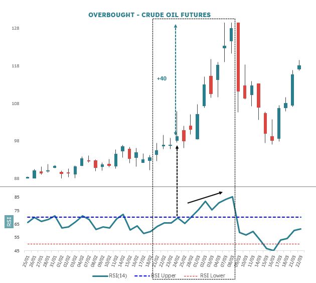 Overbought is another way of saying that the price of a security is over motivated or stretched to the upside. It implies that buying power will start declining and therefore that price will fall. Traditionally, RSI overbought is put at 70.