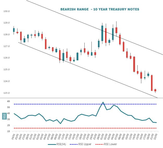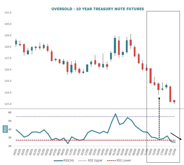 In Figure 2. I have drawn a line at 30 in the RSI panel and this level was exceeded on 16 March 2022. Price then went on to collapse. On its own, 30 as oversold in an existing downtrend implies that the downtrend is still in force and is not an invitation to step in and buy. Price is more likely to rest and then go lower.