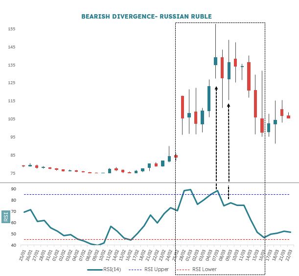 There is a more urgent signal, however, and this is when there is a dramatic drop in RSI over a couple of sessions and price either goes up a bit or stays about the same. Figure 5, is the Ruble. The 7 March Close is 138.9 and RSI is 88.6. We’re already on guard because this is very high. Two trading sessions later on 9 March the Close is similar at 136.4, but RSI has slumped to 77.7. The price difference across the two dates is -1.8%, but the RSI difference is -12.4% thus we have a sharp divergence over a short space of time. This sudden loss of power signalled the start of a precipitous decline. Think of it as a high speed stall to the upside.