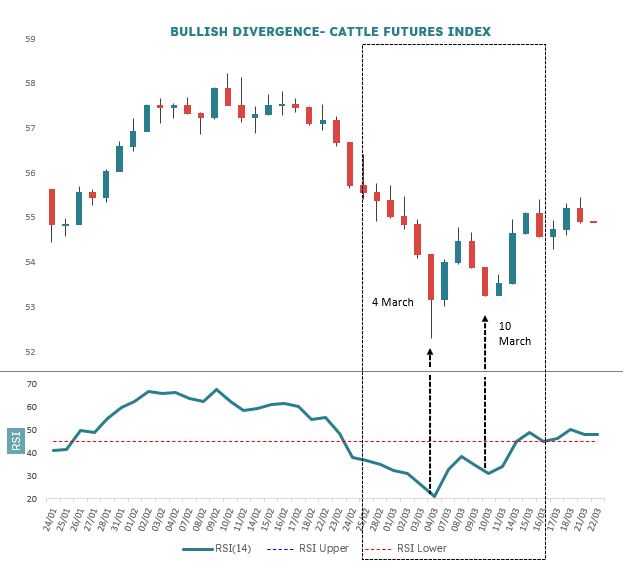Similar to a bearish divergence, however the bullish variant is a set up for a move higher. The classic interpretation is where price is in an extended decline and yet RSI starts creeping upwards – i.e. in the opposite direction. This signals that downside momentum is starting to weaken and suggests that the the downtrend is becoming exhausted – a precondition for an upside reversal and rally. You can think of RSI representing suction down and it’s not until the suction is absent that price can be released upwards again.