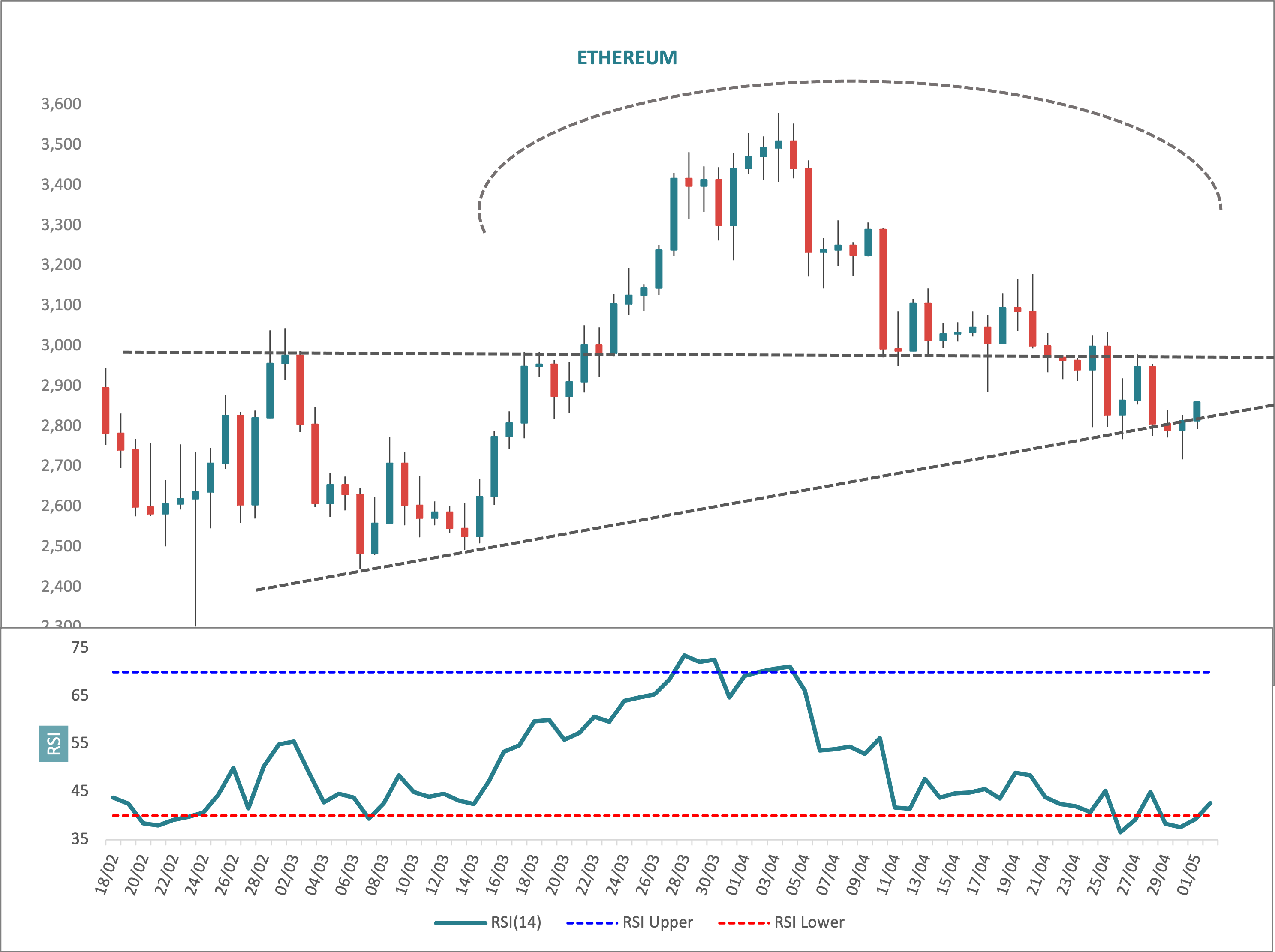 Interestingly crypto is going up while global equity markets slump, typically they are tightly coupled. The preferred view remains for an upside reversal in both Ethereum and Bitcoin. The key level to beat here is US$3,000. We need price to pass up through and find support at this level.