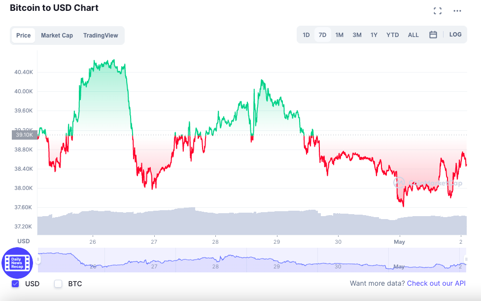 At the time of writing, Bitcoin (BTC) is trading at US$38,491.16 (+1.17%) while Ethereum (ETH) is trading at US$2,832.61 (+2.01%). The world’s largest cryptocurrency briefly slipped below US$38,000 on Monday morning before paring losses.