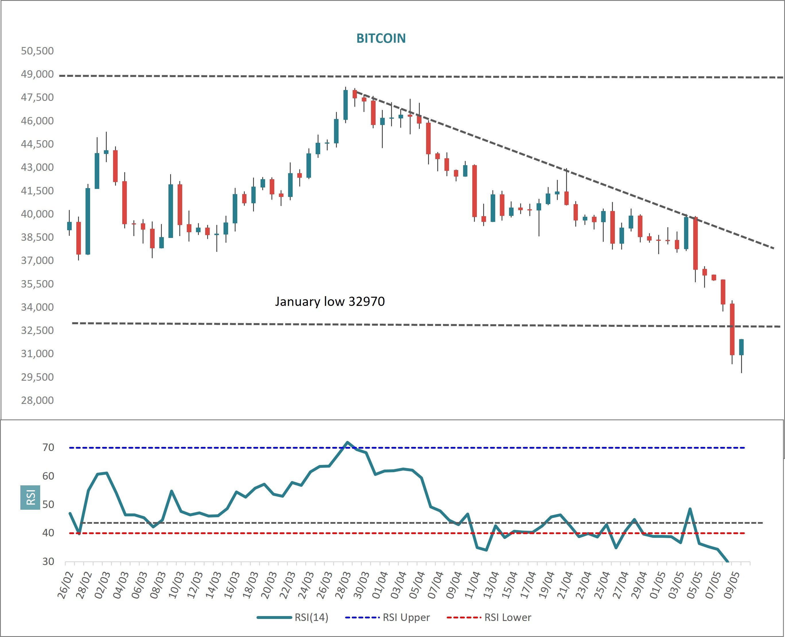 The preferred course of action is to sit out the decline and understand that there are likely to be sharp countertend rallies along the way. Until I see a viable base in for example S&P 500 Index futures and US 10-year yields start to turn lower, then Bitcoin and Ethereum will remain under pressure.