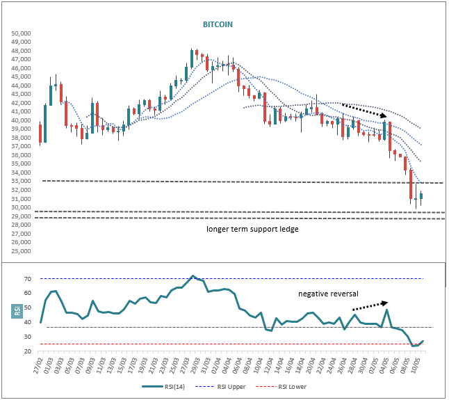 Downside force still looks to prevail and price is very likely to push on to test the big cluster of potential support between US$28,800 and US$30,400. This level marks a ledge that can be traced right back to January 2021.