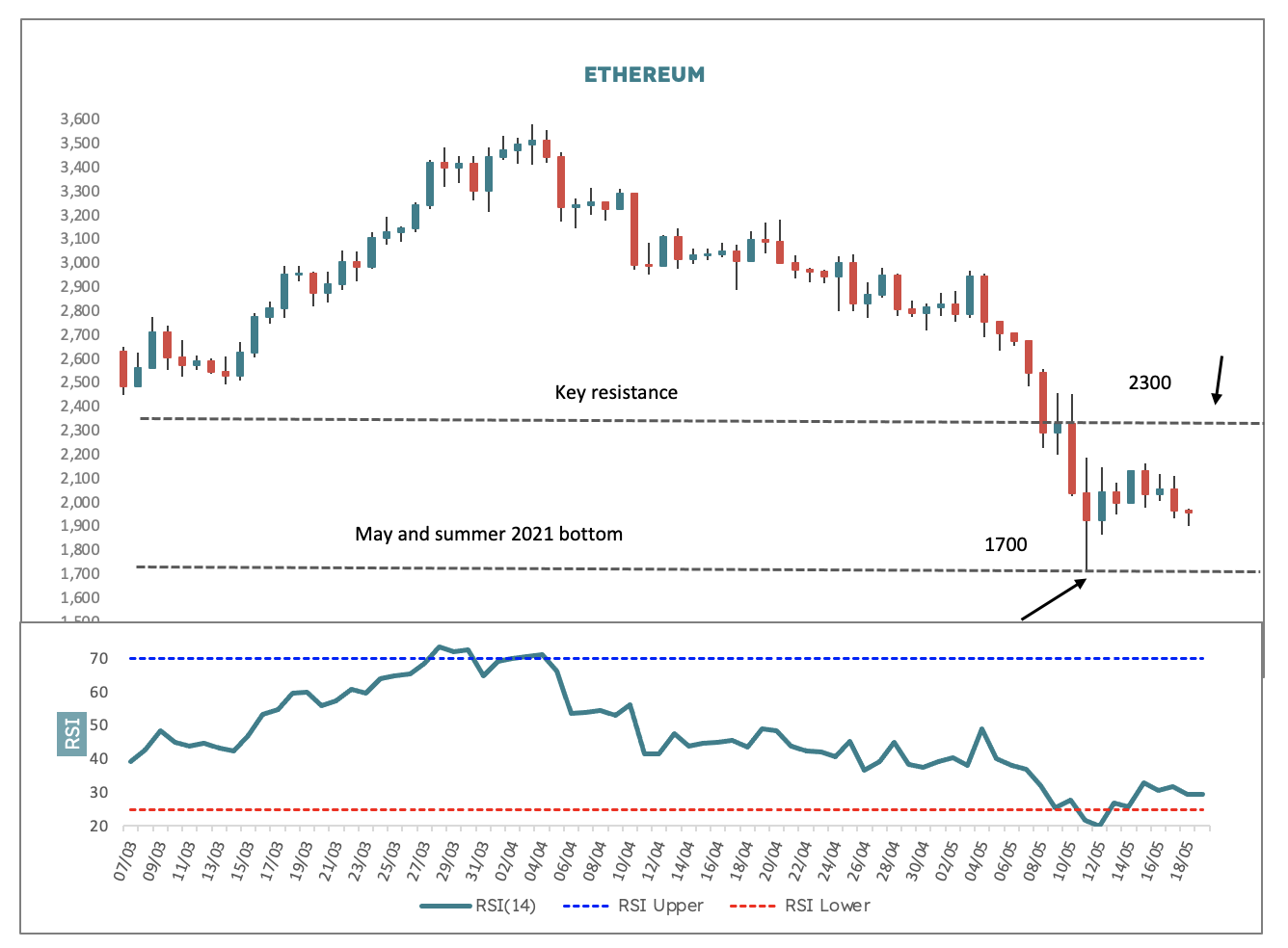 My chart annotations here are very similar to those of a few days ago, when we were looking at the very sluggish dead cat bounce in ETH. The move up has started folding in on itself as expected and price is now drifting down into the US$1,700–1,760 ostensible support range, some 200 points lower at a minimum.