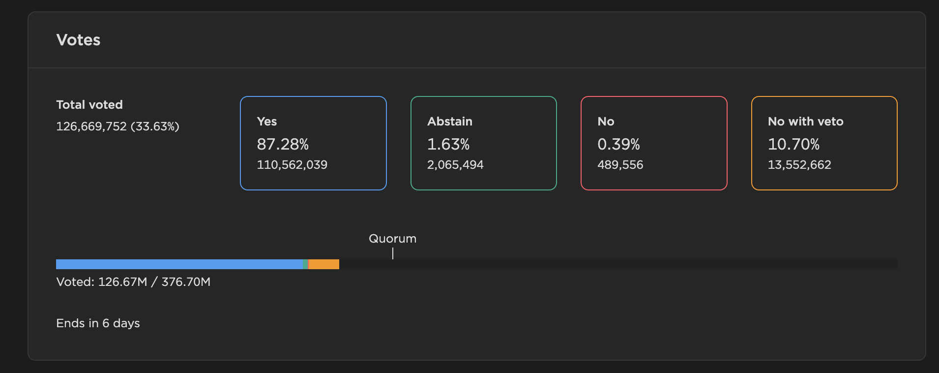 At the time of writing, 77.08% have voted in favour of the move, 1.44% are abstaining, 0.35% voted against, and 21.13% voted no with veto. So far 143.43 million have voted in the week-long poll. In order to vote, LUNA holders must connect their wallet through Terra Station or XDEFI Wallet.
