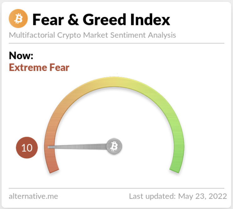 Risk appetites remain sapped – the Crypto Fear and Greed Index currently stands at 10, indicating extreme fear. The index uses 5-6 measurements to assess the current sentiment of the market and then rates that level of emotion on a scale of 1-100 – 1 is extreme fear and 100 is extreme greed.