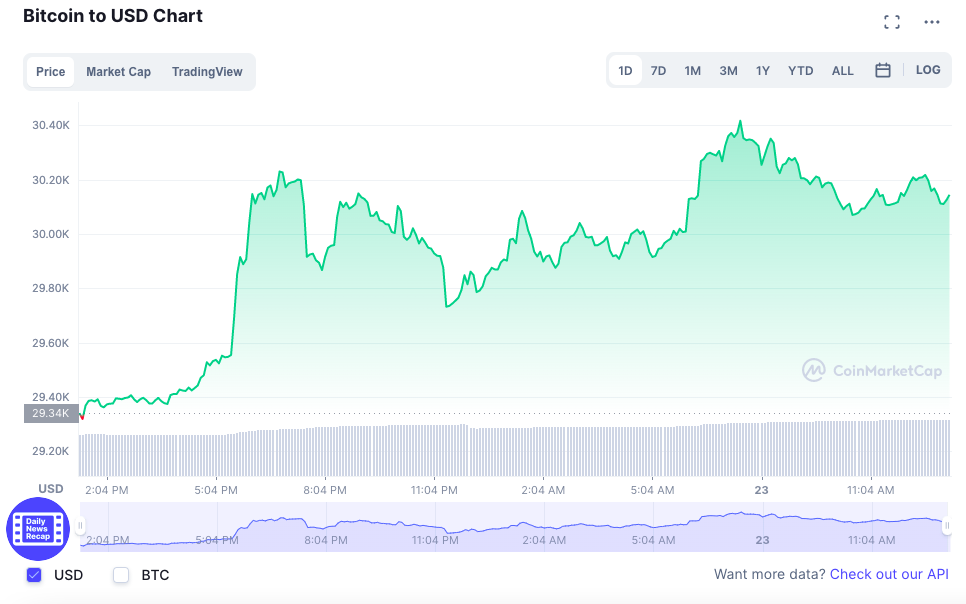 At the time of writing, the world’s largest cryptocurrency is trading at US$30,207.01 (+3.09%) while Ethereum (ETH) is trading at US$2,034.16 (3.30%).