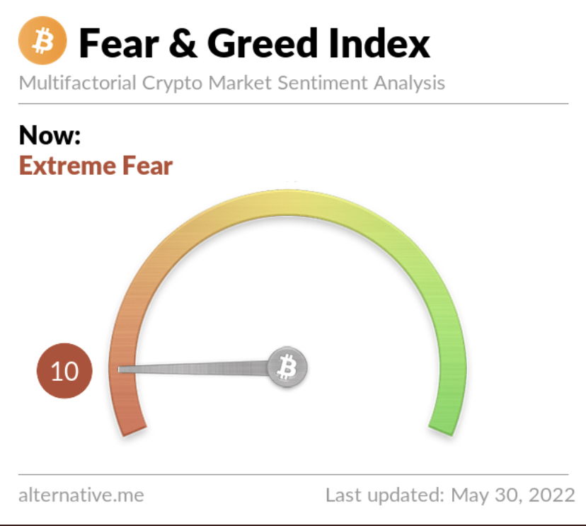 Risk appetites remain sapped – the Crypto Fear and Greed Index currently stands at 10, indicating extreme fear. The index uses 5-6 measurements to assess the current sentiment of the market and then rates that level of emotion on a scale of 1-100 – 1 is extreme fear and 100 is extreme greed.