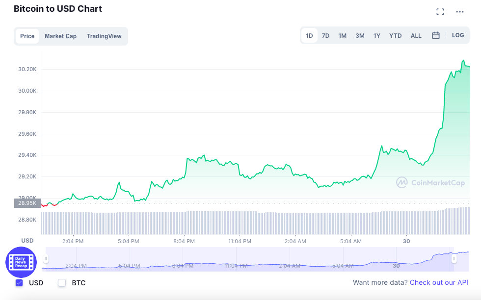 At the time of writing, Bitcoin (BTC) is trading at US$30,321.43 (+4.72%) while Ethereum (ETH) is trading at US$1,878.27(+5.98%). Major altcoins such as Solana (SOL) and Avalanche (AVAX) have also been trading in green over the past 24 hours.