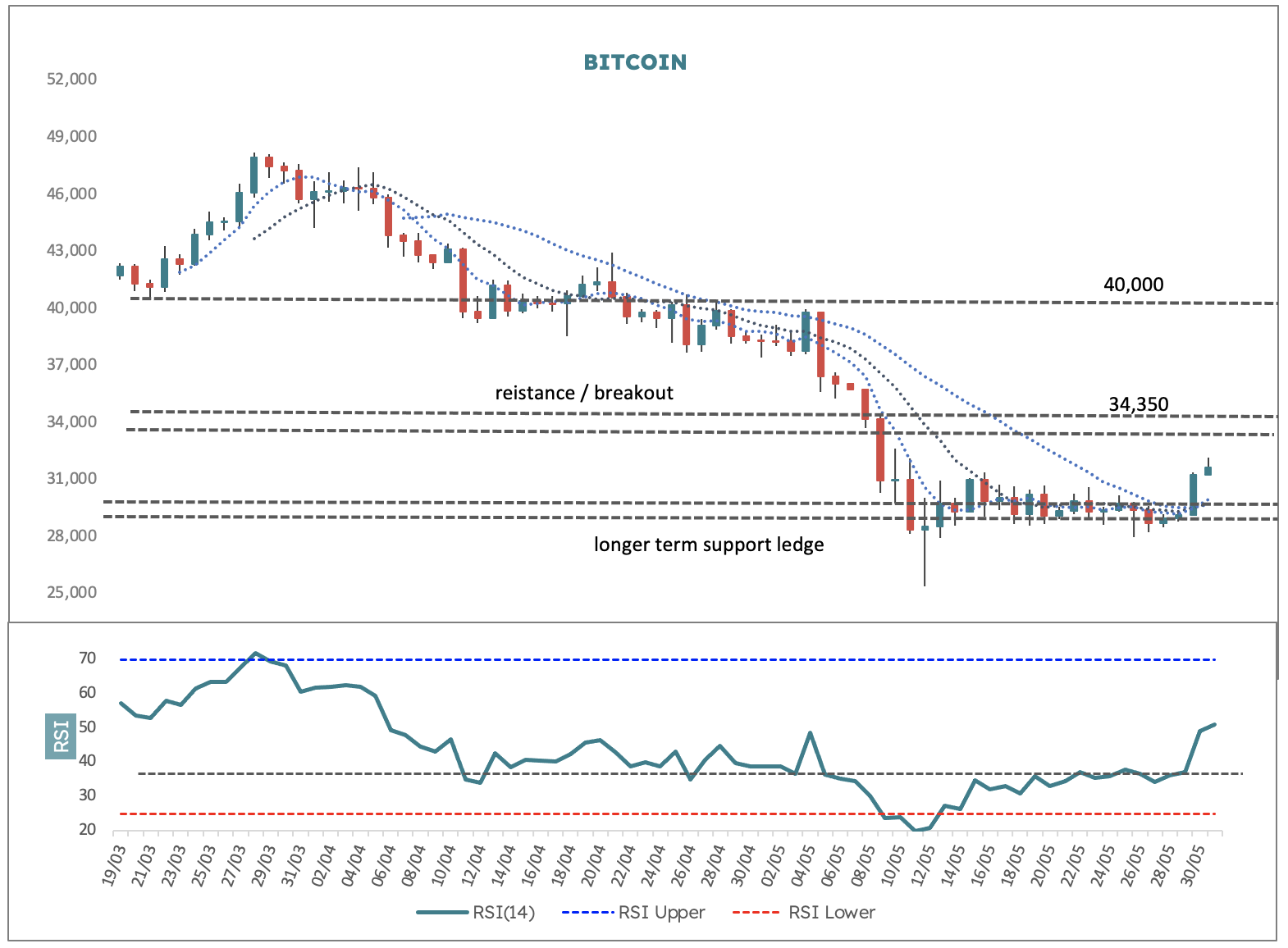 The technical omens are positive for a break out and move higher through this level, but it must be cleared successfully and then act as a ledge before we can sensibly look up. The next higher level of interest above would be US$40,000 which is an even stronger level of support/resistance going all the way back to June 2021.