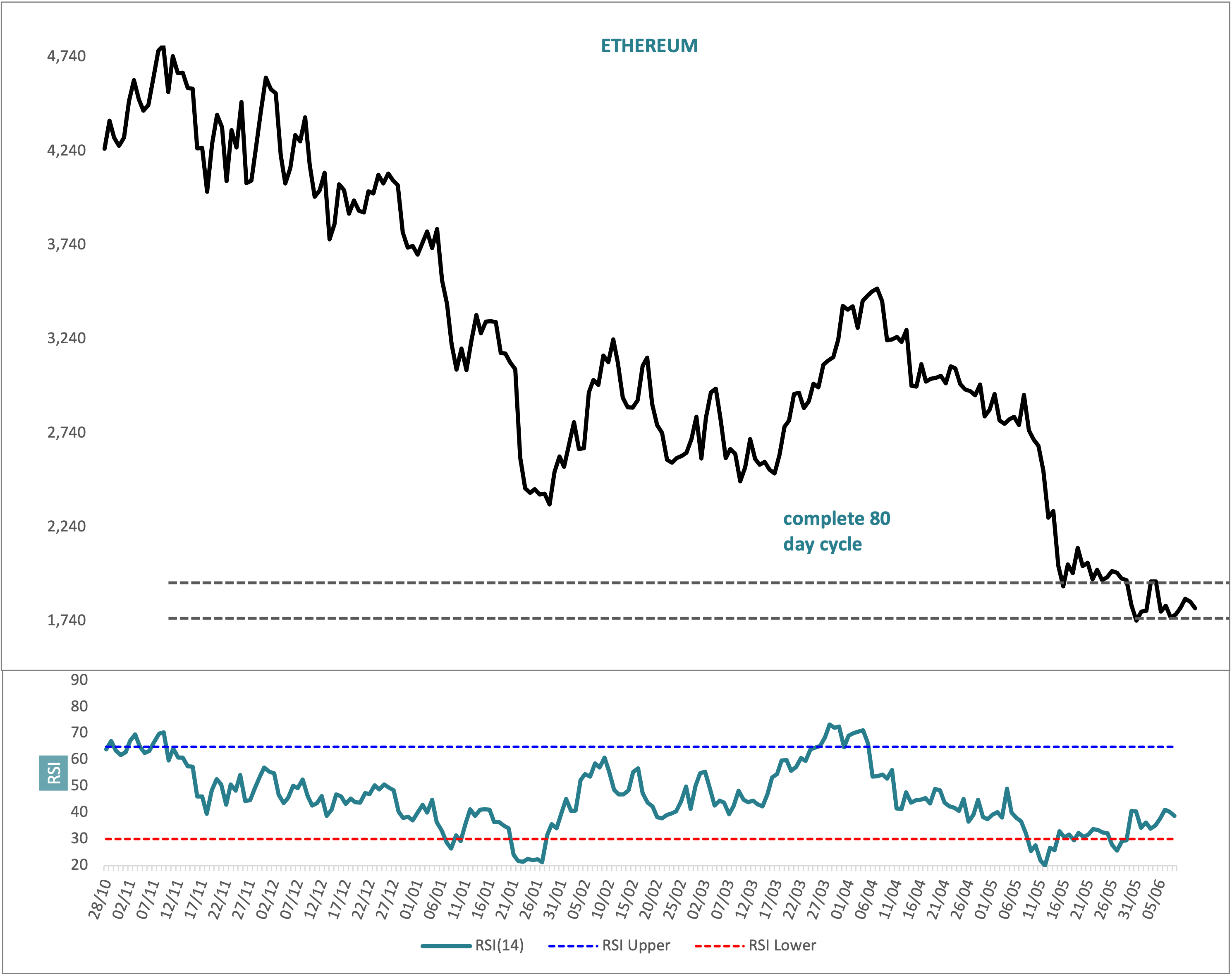 Now, some 10 months later, the price is back here testing again, in other words there has been a complete round trip. At the same time, there is a fairly uniform 80 day cycle in Ethereum and price is currently in the cycle trough zone.