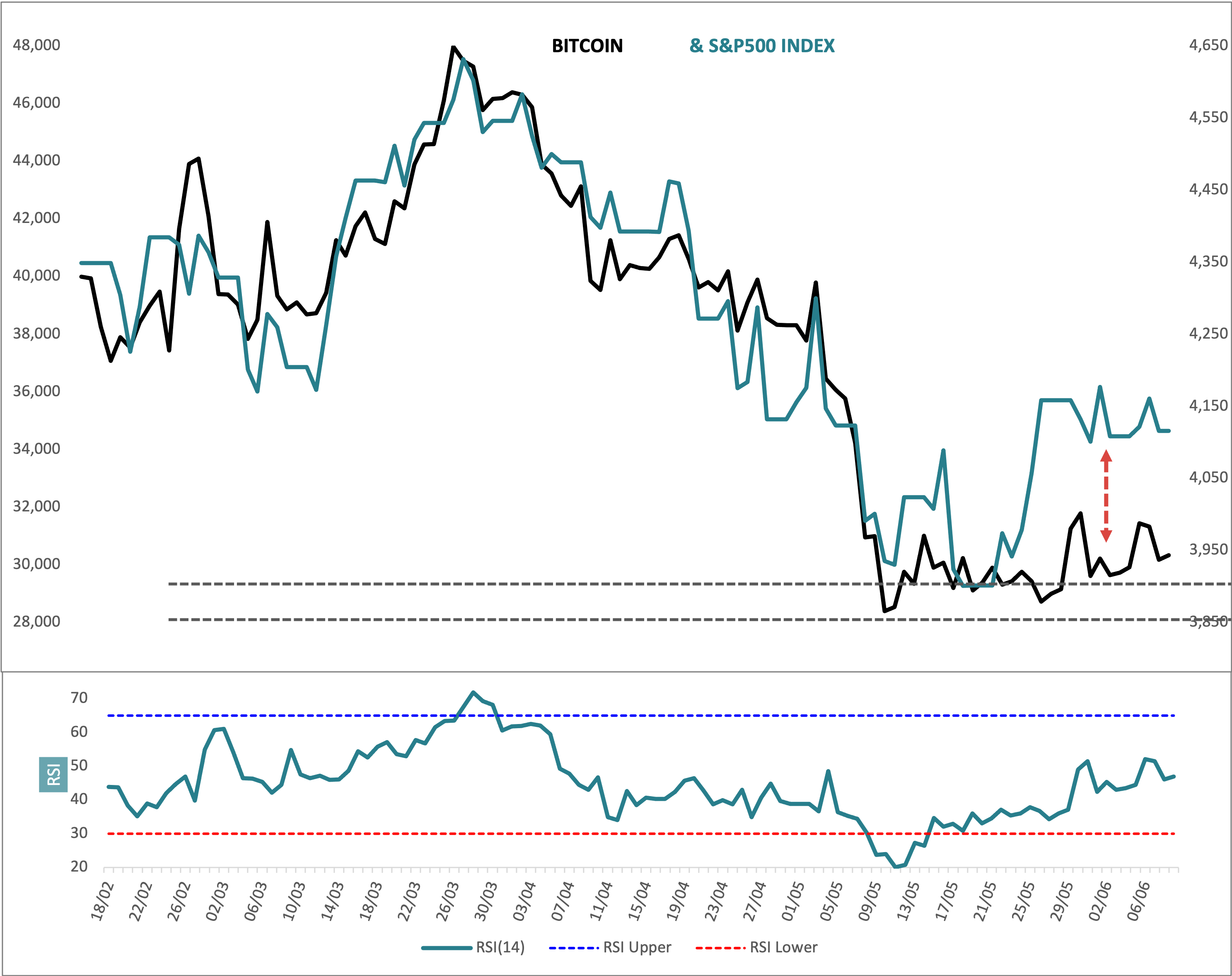 The correlation between Bitcoin and the S&P500 since the start of this year is 0.86, which means the two series move more or less together. Since the big low in the SPX in March 2020, the correlation is higher at 0.90. However, over the last month the correlation as shrunk down to 0.34, which means that a decoupling has taken place. This shows up in the chart quite clearly. The blue line (SPX) has tracked the black line (XBT) almost exactly until very recently when a spread has emerged (highlighted by the red arrow).
