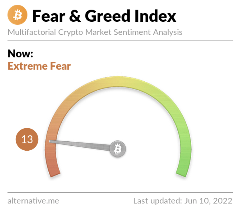 Risk appetites remain sapped – the Crypto Fear and Greed Index currently stands at 13, indicating extreme fear. The index uses 5-6 measurements to assess the current sentiment of the market and then rates that level of emotion on a scale of 1-100 – 1 is extreme fear and 100 is extreme greed.