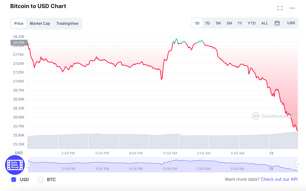At the time of writing, Bitcoin (BTC) is trading at US$25,706.12 (-7.71%) while Ethereum (ETH) is trading at US$1,357.29 (-7.85%) – its lowest point since January 2021. Major altcoins such as Avalanche (AVAX) and Solana (SOL) have also been trading in red over the past 24 hours.