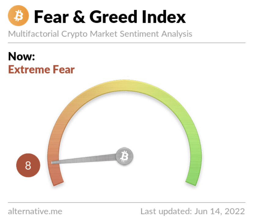 Risk appetites are really, really sapped – the Crypto Fear and Greed Index currently stands at 8, down from yesterday’s score of 13, indicating [very] extreme fear. The index uses 5-6 measurements to assess the current sentiment of the market and then rates that level of emotion on a scale of 1-100 – 1 is extreme fear and 100 is extreme greed.