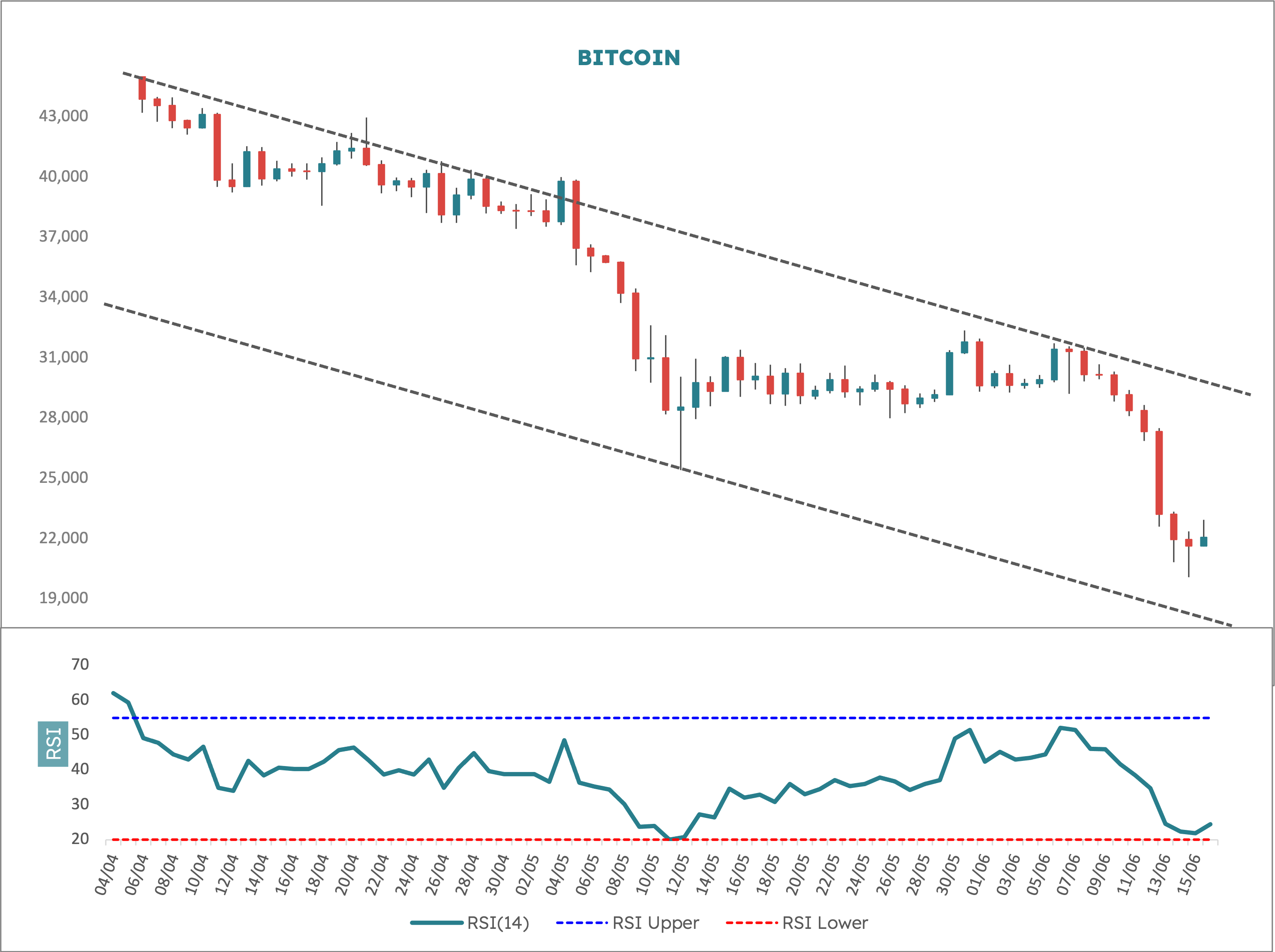 You can see from the simple chart that the March channel is still down and we are not at the bottom yet (that’s just below US$20,000 as well). RSI may well be oversold, and may well have jumped a little, but in the circumstances it signifies little.