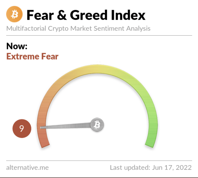Risk appetites are really, really sapped – the Crypto Fear and Greed Index currently stands at 9, indicating extreme fear. The index uses 5-6 measurements to assess the current sentiment of the market and then rates that level of emotion on a scale of 1-100 – 1 is extreme fear and 100 is extreme greed.