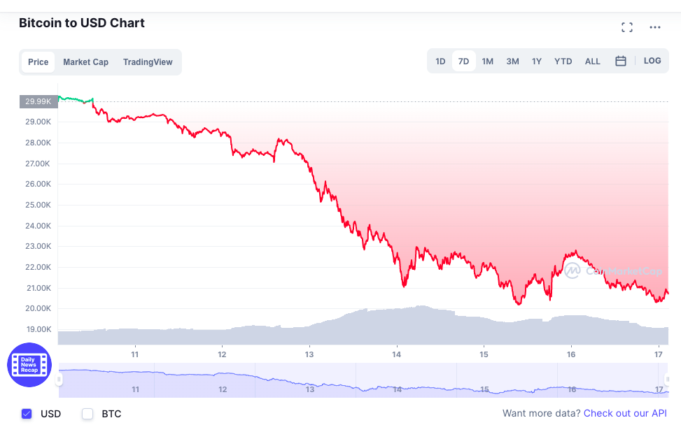 Bitcoin and other cryptocurrencies fell through multiple support levels throughout the week, with the world’s largest cryptocurrency hovering just below the US$21,000 mark for now after a brief post-Fed announcement rally yesterday.