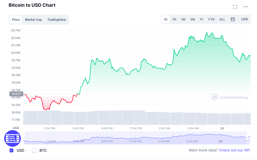 At the time of writing, Bitcoin (BTC) is trading at US$19,986.33 (+8.27%) while Ethereum (ETH) is trading at US$1,078.23 (+13.03%). Major altcoins such as Solana (SOL) and Avalanche (AVAX) have also been trading in green since yesterday after suffering significant losses over the weekend.