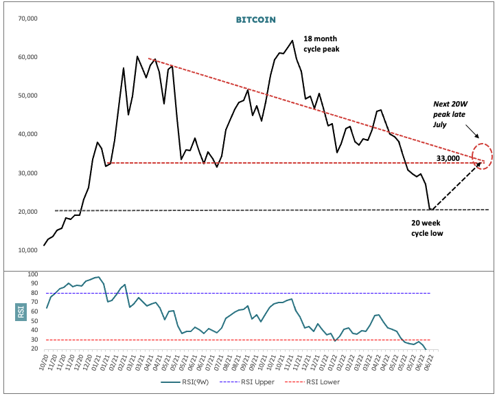 In yesterday’s note, we looked at slew of potentially bullish technical signals that pointed to the crash low of US$17,500 over the weekend being a significant bottom. As such, a rally should follow. The strength and duration of this rally is a function of the significance of the low. And significance speaks to cycles. So let’s do a quick analysis of the key cycles at play.