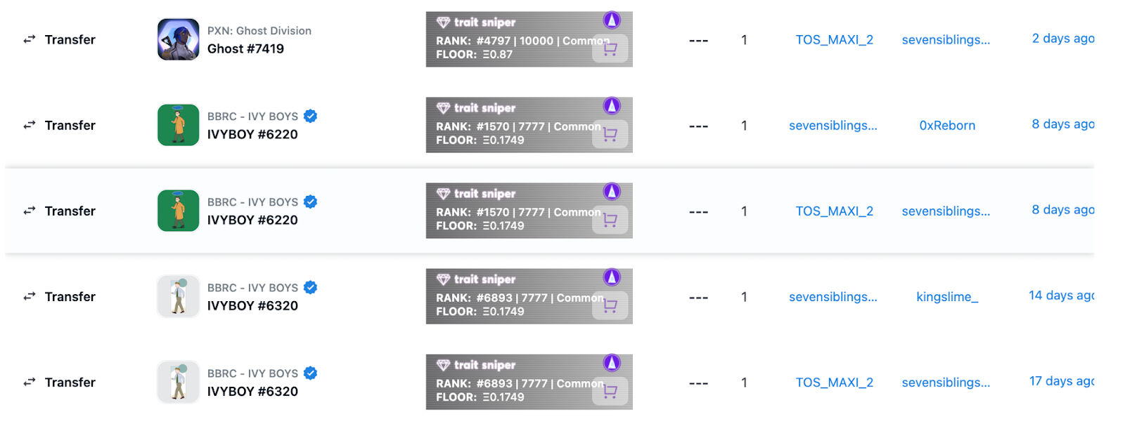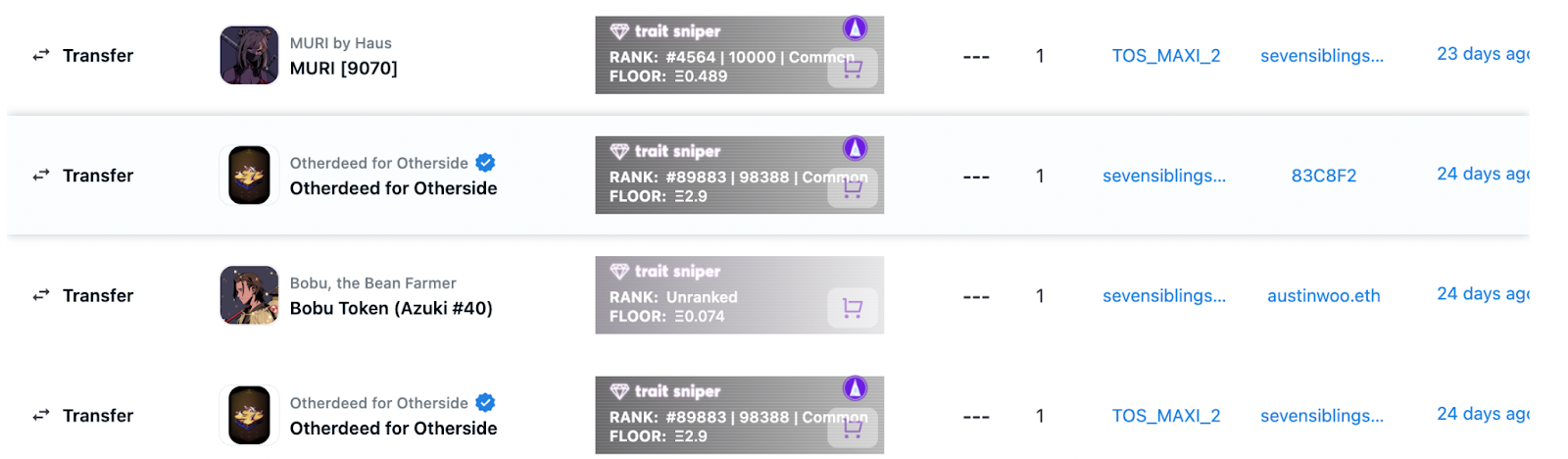 The first suspicious wallet, flagged by Discord community member hendrix#6391, belonged to sevensiblings.eth; the owner had received 5 NFTs, including highly coveted top prizes like Otherdeed, BBRC – IVYBOY, and PXN: Ghost Division, from TOS_MAXI_2 (a treasury wallet) over the course of a month.