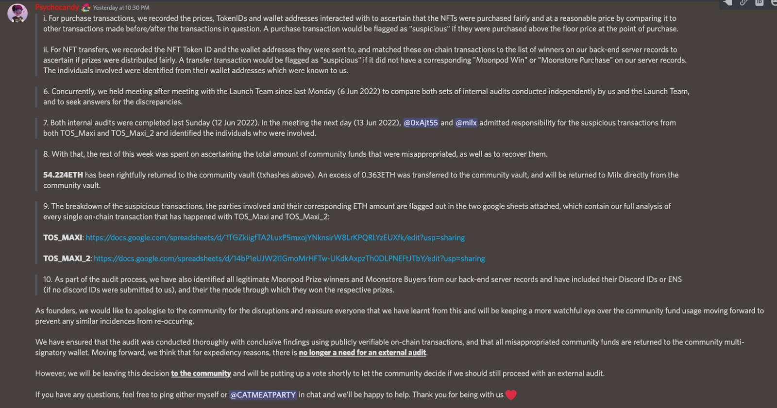 Following an internal audit triggered by a TOS community member who first noticed the suspicious transactions, team members @0xAjt55 and @milx#9779 were found to have rigged the system to receive over 50 ETH worth of NFTs themselves.