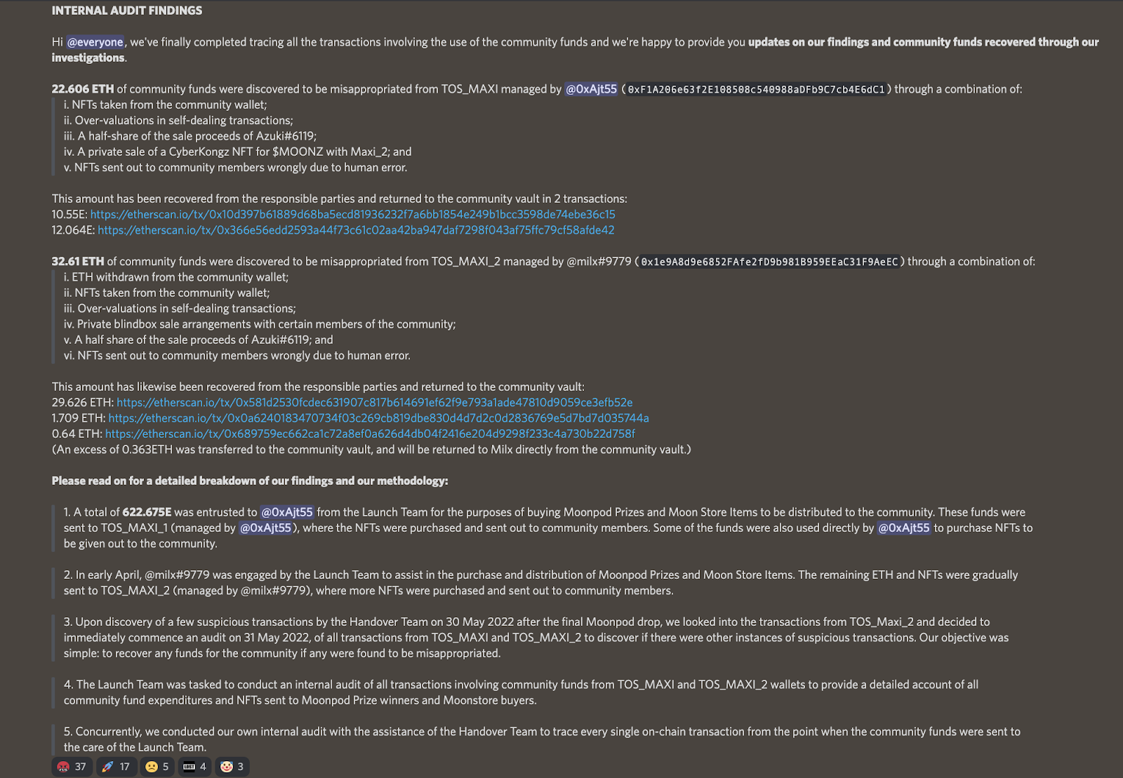 “32.61 ETH of community funds were discovered to be misappropriated from TOS_MAXI_2 managed by @milx#9779,” TOS added.