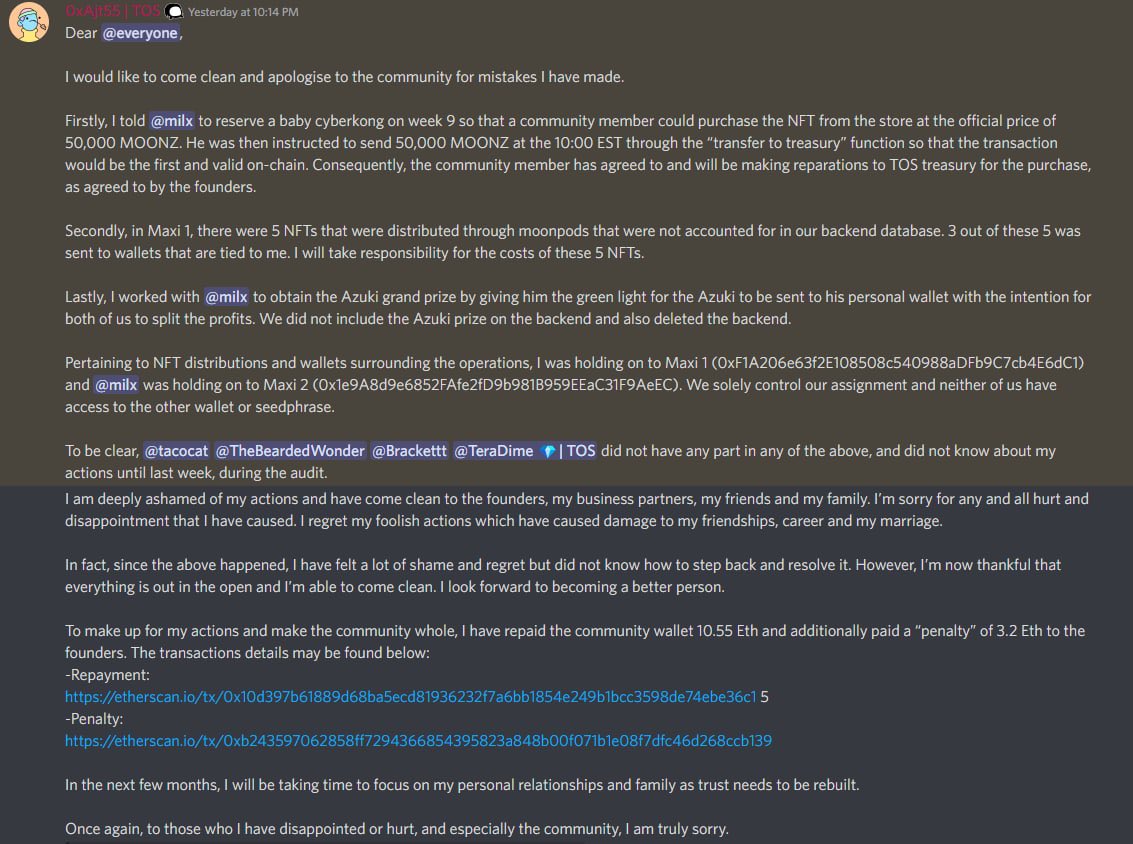 Following the revelation about Tan, TOS released an official statement on their Discord. “22.606 ETH of community funds were discovered to be misappropriated from TOS_MAXI managed by 0xAjt55,” the stataement reads.