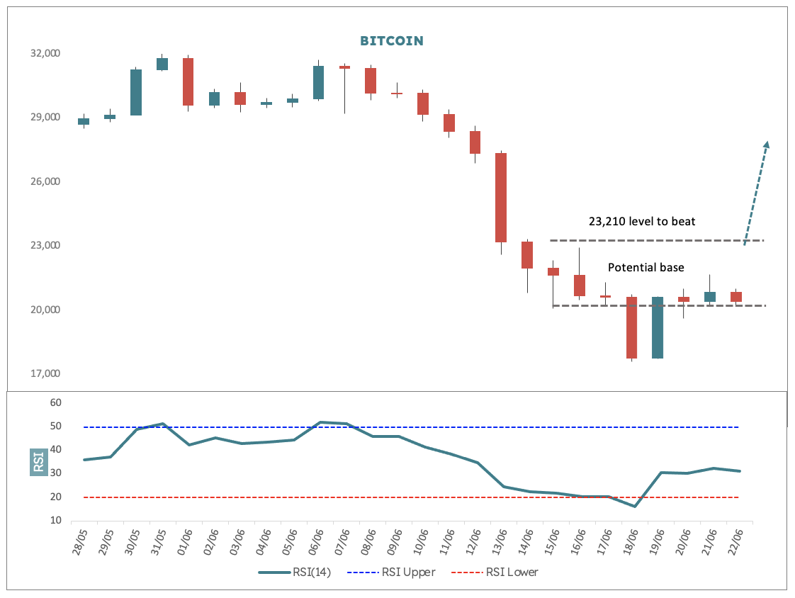 Bitcoin’s price looks to be forming a base with the level to beat near term at US$23,210, which is the open on 14 June. It’s not uncommon for push up and pull back sequences to occur in these market phases.