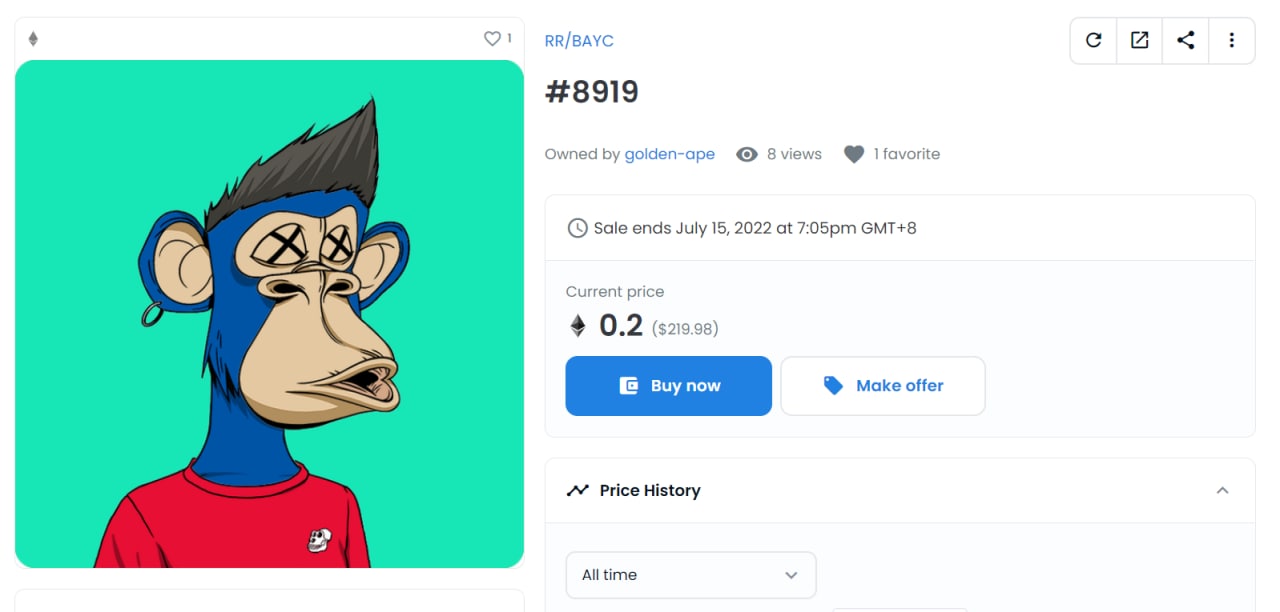 BAYC #8919 on the left vs RR/BAYC #8919 on the right. The JPEGs of each ape are completely identical, yet RR/BAYC remains up on Opensea.