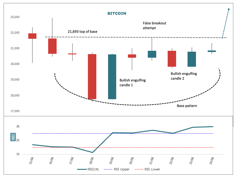 Looking at the chart we have what looks to be a classic base formation. The entire structure can be described as a “U” shape; there has been a false breakout (very typical of bases) with a high of US$21,693, which we can now consider to be the top of the base.