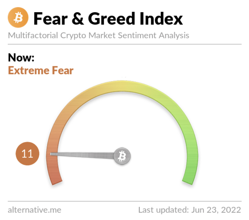 Risk appetites are sapped – the Crypto Fear and Greed Index currently stands at 11, indicating extreme fear. The index uses 5-6 measurements to assess the current sentiment of the market and then rates that level of emotion on a scale of 1-100 – 1 is extreme fear and 100 is extreme greed.
