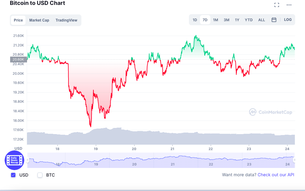 Bitcoin and other cryptocurrencies traded sideways throughout the week, with the world’s largest cryptocurrency recovering from a low of US$17,593 to hover just above the US$21,000 point for now.