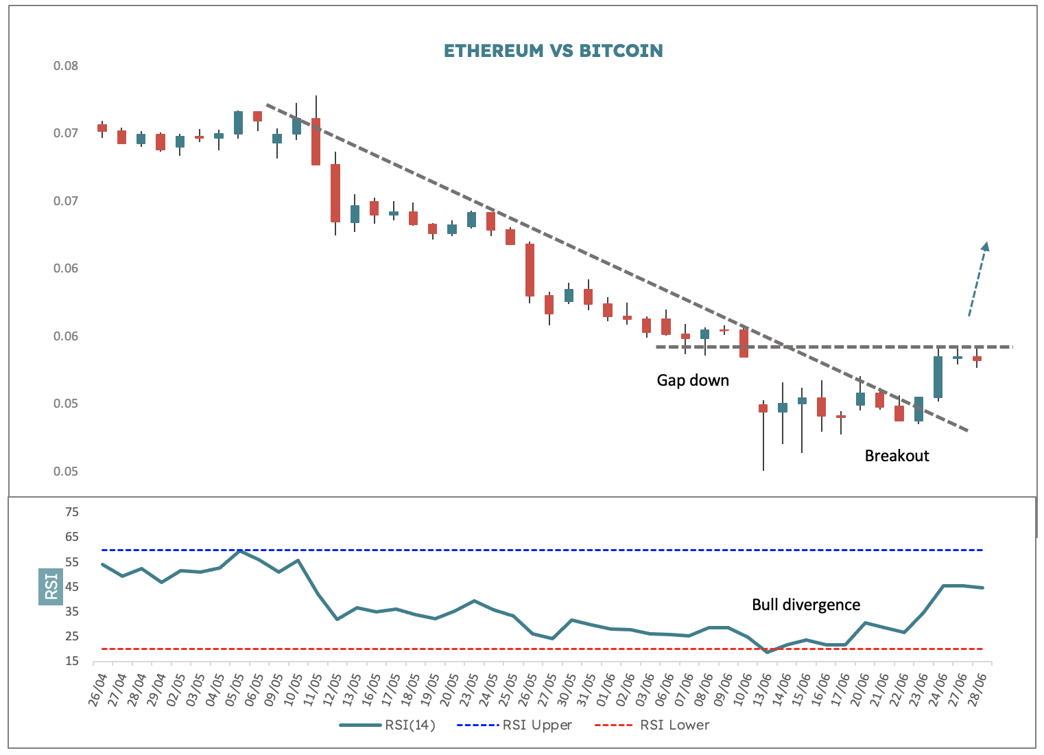 Simple uncluttered note today while we wait for crypto’s absolute price to settle and show us what its made of.. On 24 June the Ethereum-Bitcoin spread broke out from its April down channel. As a matter of fact it also jumped free of a longer shallower channel going back to December 2021.