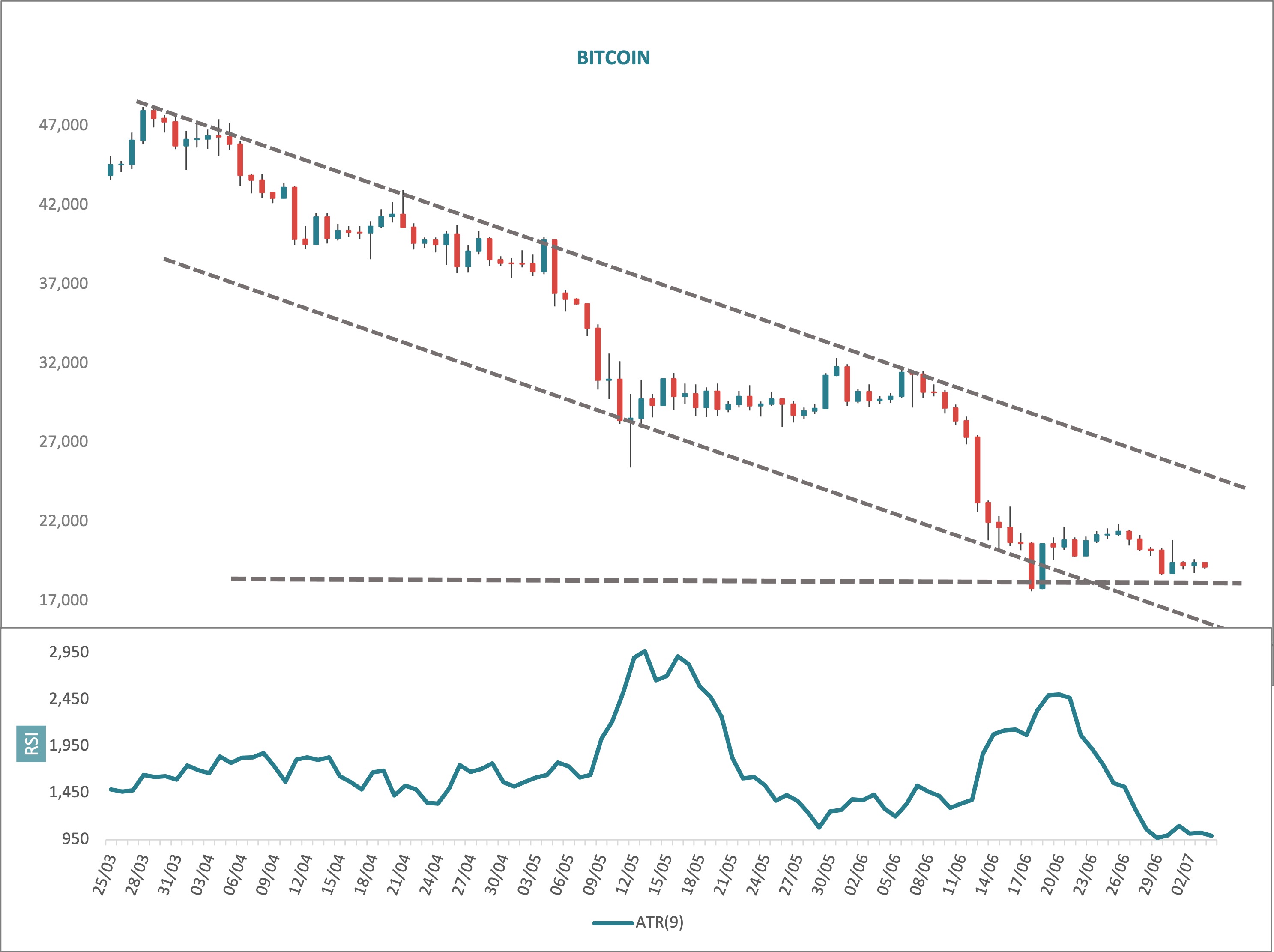 Bitcoin’s US$17,600 low on 18 June corresponds more or less precisely to a range low within a month long sideways uptrend congestion period back between mid November and mid-December 2020. Its price has been above this level ever since.