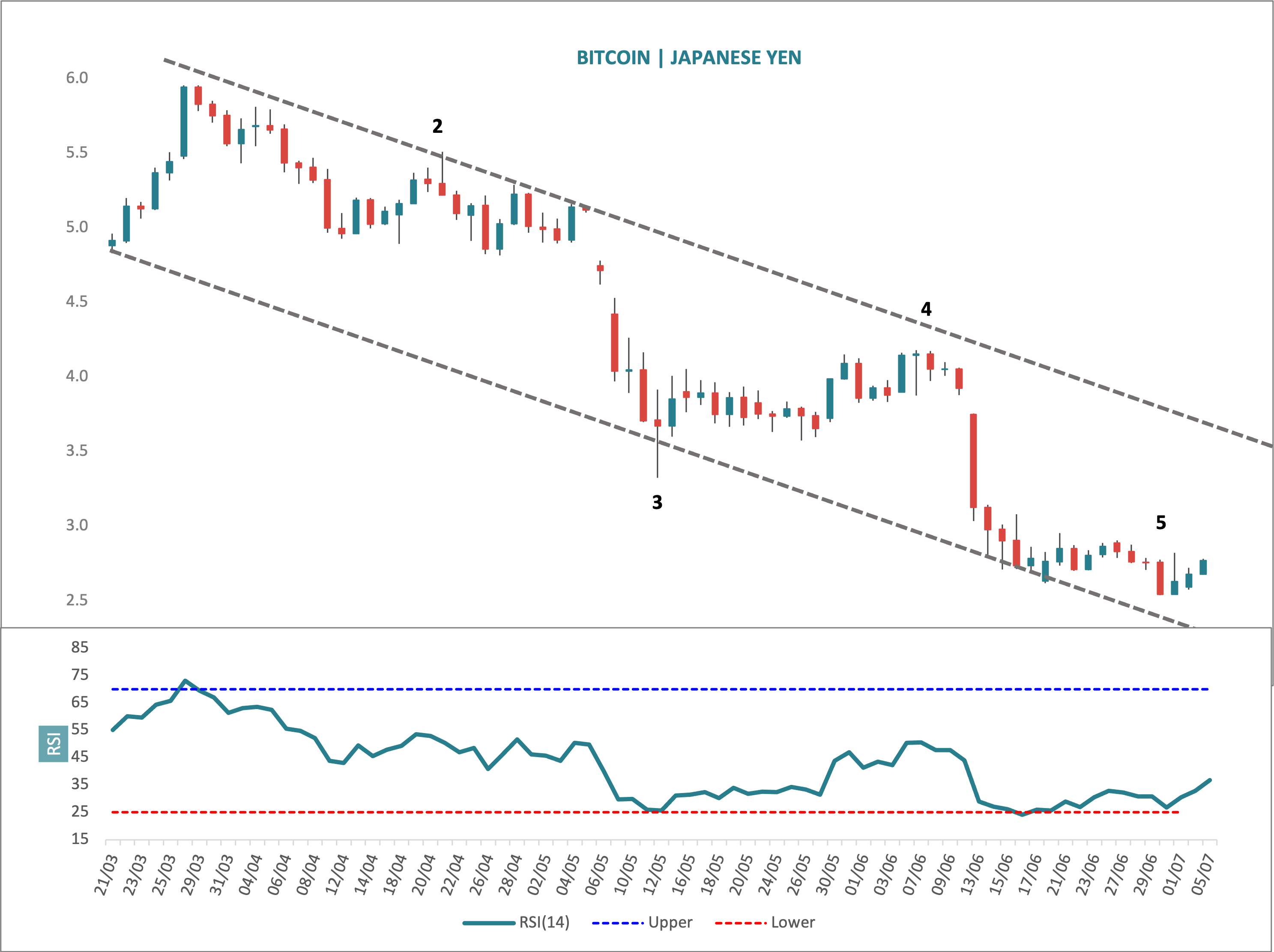 There is a clear 5 count with three swift pro-trend down waves 1, 3 and 5 and two non-overlapping countertrend waves 2 and 4. When we can count out five distinct waves and especially in a nice channel, we should start looking for the end of the move.. XBTJPY needs to confirm but let’s keep a sharp eye on it now.