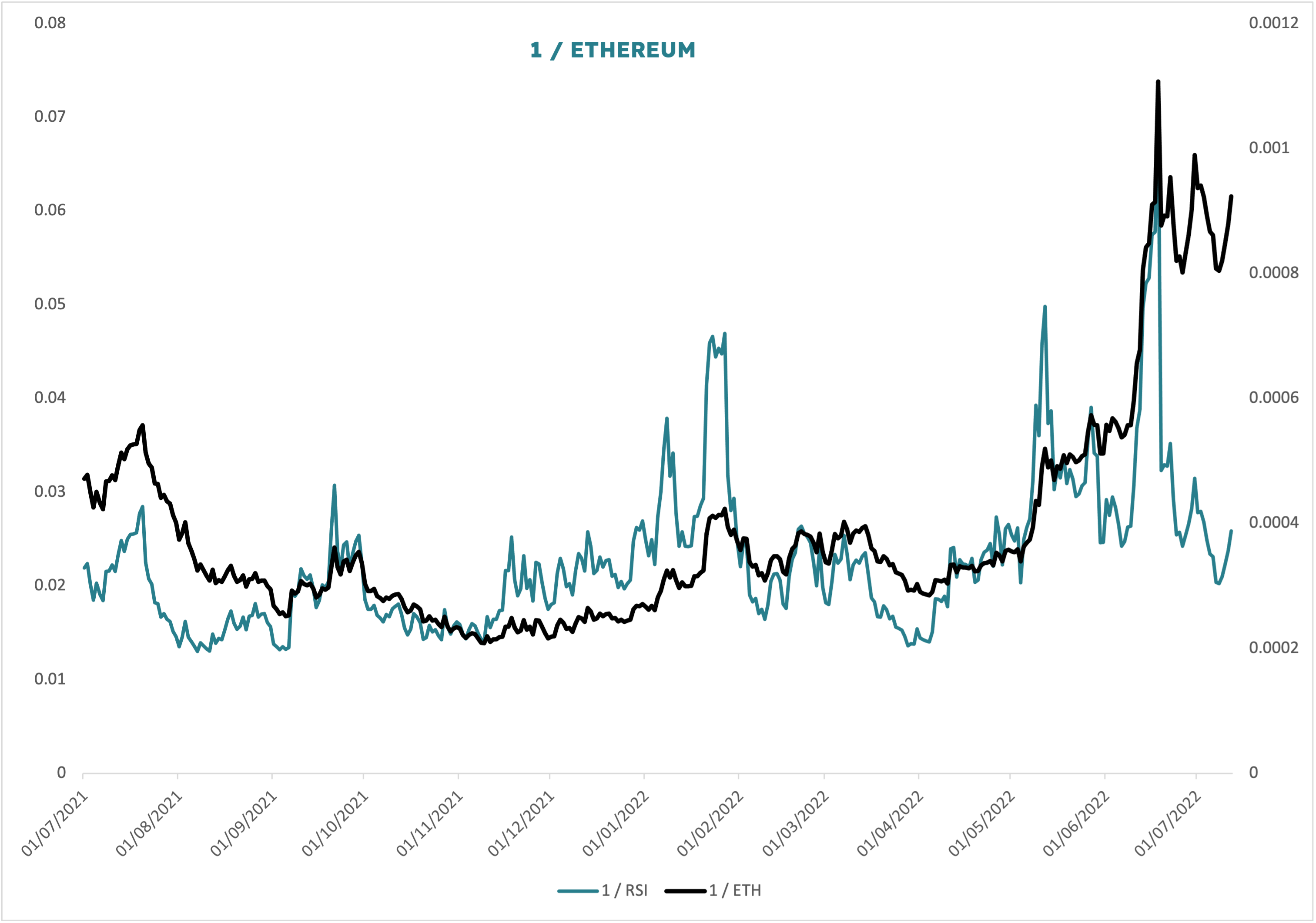 Sometimes it helps to invert a chart to see if it offers more insight that way. Here I have simply reformatted as follows: 1 / Ethereum and 1 / RSI. So whereas set normally we would be looking at a falling line for ETH, here we see a rising one.