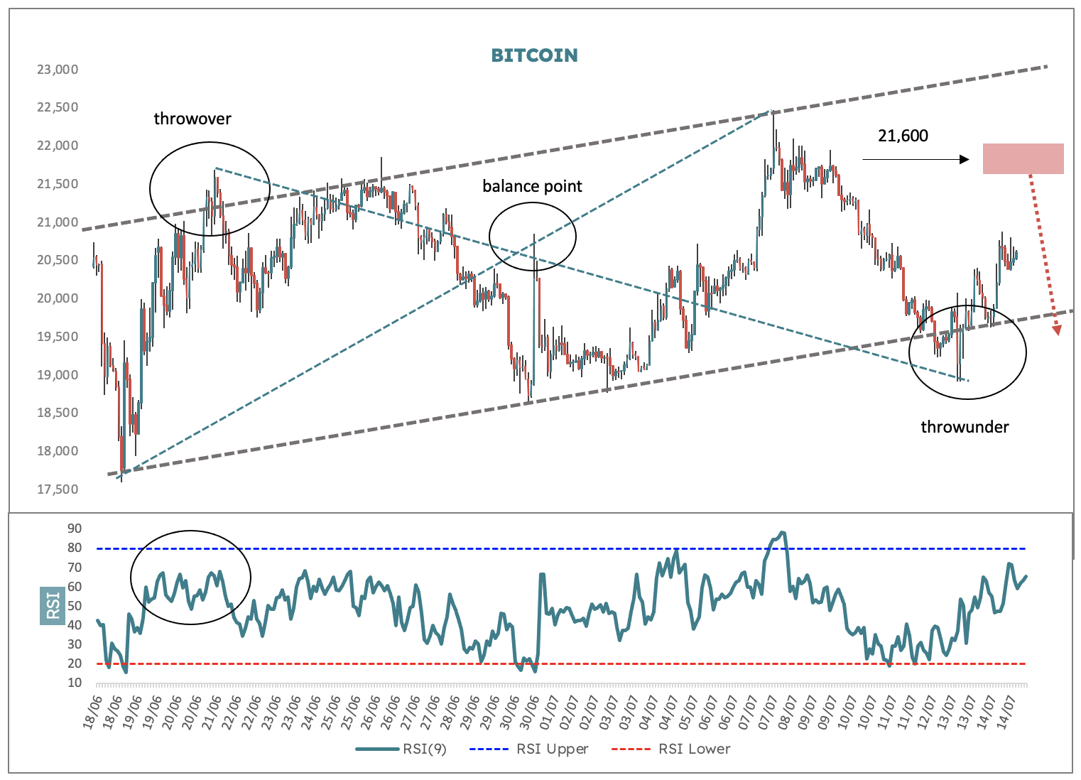 Now look at the spike lower and rebound on 13 July, this is the same concept but in reverse and is called a throwunder. Because the market is always looking to balance itself, we often see this sequence – failed break up and then failed break down to balance it out across a pattern. Note also the intersection of lines mid chart where price failed again mid chart, this is also often seen in a balancing move.