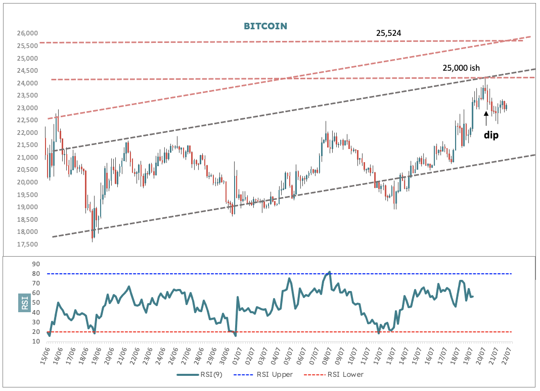 The chart in Bitcoin here again at 240 minutes is clearly a corrective structure and as such I hesitate to call a massive upside extension here. There are some obvious markers ahead of us, which could serve as meaningful resistance. The first is around US$25,000 the top of the ostensible corrective channel. This is my preferred view; it doesn’t quite reach there and collapses. The second is the US$25,524 level, which is the 12 May spike low for some 10%.