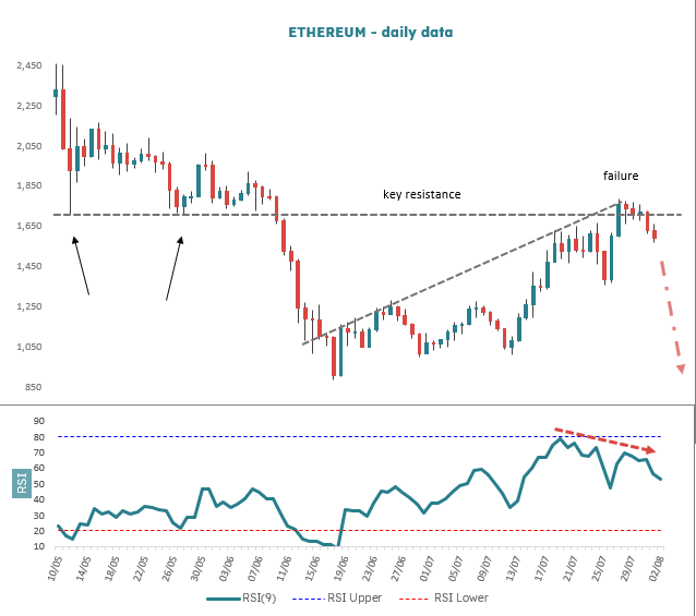 Yesterday we looked at Ethereum failing to take out key resistance at US$1,705 last week and starting to track downwards. The 240 minute chart here shows a little more detail of the rally from 13 July.