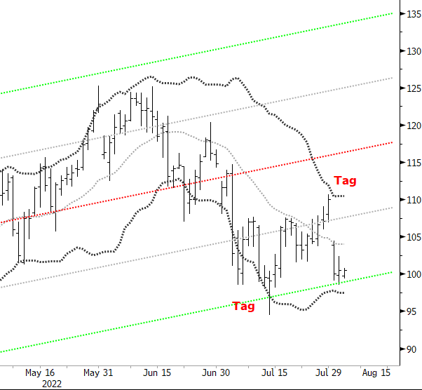 Figure 1 shows two band tags. In mid-July price tags the lower band, but does not close below it (only the days low penetrates the band). Price then retreats back up to the moving average, fails to breach it at the first test, but then goes on to tag the upper band at the end of July. Notice that price does not quite reach the upper band, so it’s a partial tag and a sign of potential weakness.