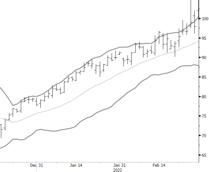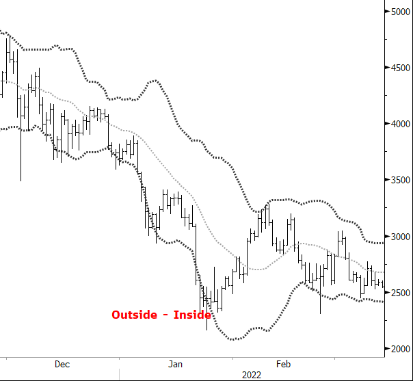 In a fast or trending market band width expands and price tends to run along the upper band in an uptrend or the lower band in a downtrend. Figure 3 shows price hugging the underside of the upper band, which is pointing up and notice that it’s not until mid-February that we actually see a close above the upper band, followed by an inside day and a sharper pullback.