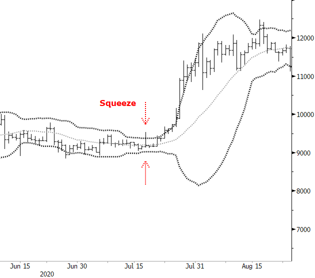 Typically the breakout tends to occur in the same direction as the trend phase running into the squeeze, but the best signal is to wait for a close outside the band. Whatever direction that is should be the direction of the breakout. Figure 4 shows a substantial narrowing of the bands into mid-July 2020 followed by a strong uptrend regime.