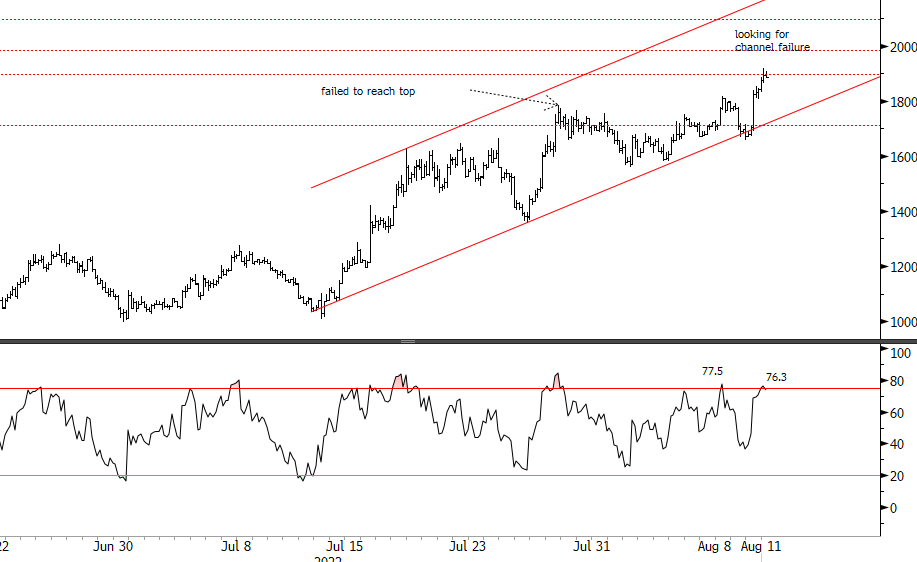 In the chart, even if price reaches the first barrier around US$1,980 and pulls back, it would still represent a failure to reach the top of the mid-July up channel (which would be the second and is technical weakness) and notice that nine-period RSI has spiked from (8 August peak) of 77.5 versus 76.3 so far this session. So it has dropped slightly despite the price thrust. This is a small signal so far, but does imply that the ramp up is not all that it could be.