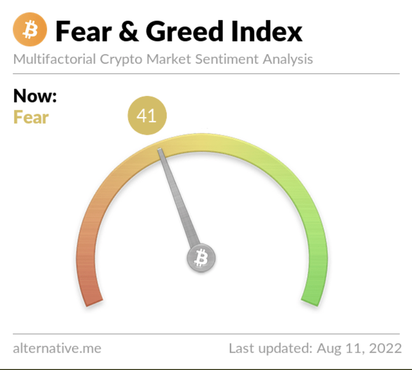 Risk appetites are still somewhat sapped – the Crypto Fear and Greed Index currently stands at 41, indicating fear. The index uses 5-6 measurements to assess the current sentiment of the market and then rates that level of emotion on a scale of 1-100 – 1 is extreme fear and 100 is extreme greed.